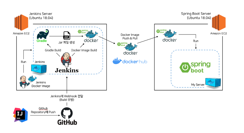 CI/CD 구조 Jenkins Server : AWS EC2 Ubuntu 18.04 Spring Boot Server : AWS EC2 Ubuntu 18.04 Github Repository Docker Hub Repository 사전 준비 Jenkins Serve