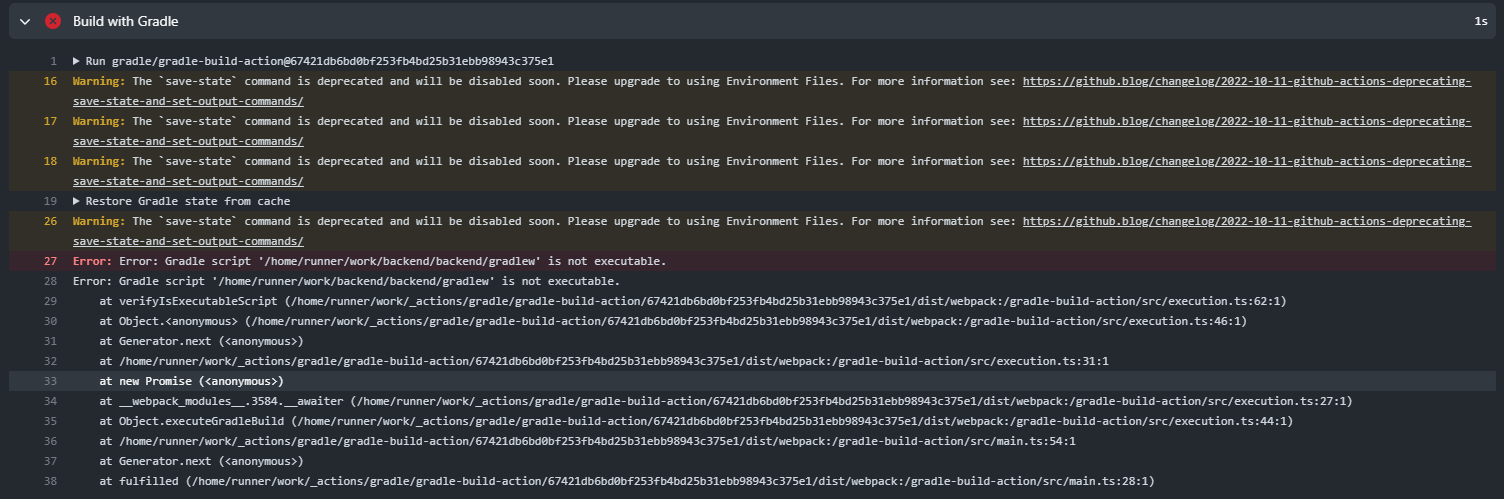 Error: Error: Gradle script '/home/runner/work/backend/backend/gradlew' is not executable. Error: Gradle script '/home/runner/work/backend/backend/gradlew' is not executable. at verifyIsExecutableScript (/home/runner/work/_actions/gradle/gradle-build-action/67421db6bd0bf253fb4bd25b31ebb98943c375e1/dist/webpack:/gradle-build-action/src/execution.ts:62:1) at Object.<anonymous> (/home/runner/work/_actions/gradle/gradle-build-action/67421db6bd0bf253fb4bd25b31ebb98943c375e1/dist/webpack:/gradle-build-action/src/execution.ts:46:1) at Generator.next (<anonymous>) at /home/runner/work/_actions/gradle/gradle-build-action/67421db6bd0bf253fb4bd25b31ebb98943c375e1/dist/webpack:/gradle-build-action/src/execution.ts:31:1 at new Promise (<anonymous>) at webpack_modules.3584.__awaiter (/home/runner/work/_actions/gradle/gradle-build-action/67421db6bd0bf253fb4bd25b31ebb98943c375e1/dist/webpack:/gradle-build-action/src/execution.ts:27:1) at Object.executeGradleBuild (/home/runner/work/_actions/gradle/gradle-build-action/67421db6bd0bf253fb4bd25b31ebb98943c375e1/dist/webpack:/gradle-build-action/src/execution.ts:44:1) at /home/runner/work/_actions/gradle/gradle-build-action/67421db6bd0bf253fb4bd25b31ebb98943c375e1/dist/webpack:/gradle-build-action/src/main.ts:54:1 at Generator.next (<anonymous>) at fulfilled (/home/runner/work/_actions/gradle/gradle-build-action/67421db6bd0bf253fb4bd25b31ebb98943c375e1/dist/webpack:/gradle-build-action/src/main.ts:28:1)