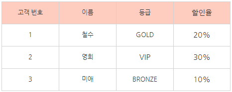 이 테이블에서는 A=고객번호, B=등급, C=할인율이 된다. 여기서 등급은 고객 번호에 의해 결정되어지고 있는데, 할인율은 등급에 의해 결정되고 있다. 이럴 때에 문제가 생길 수 있는데, 고객 번호 3의 등급이 Bronze에서 VIP로 변경되었다고 가정해 보자. 이때에는 등급이 높아졌음에도 할인율은 10%로 그대로이다. 물론 등급에 맞게 할인율 또한 변경할 수 있지만, 매우 번거로워진다. 이럴 때에는 아래와 같이 테이블을 분리해 준다.