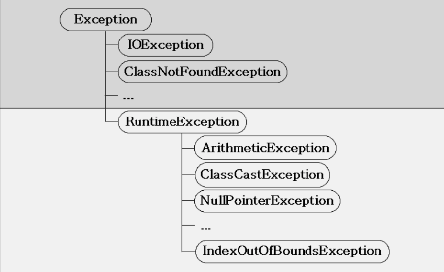 - Exception 클래스와 그 자손들 - 'checked 예외' (예외 처리 필수)