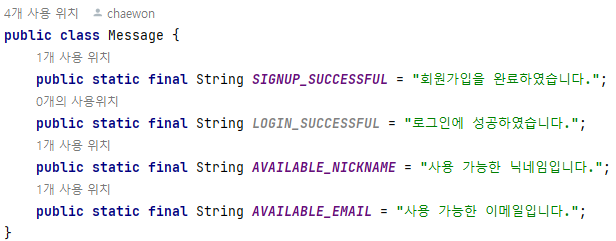 + 에러(예외 처리)메세지나 성공했을 때의 메세지를 한 곳에서 관리할 수 있도록 만들었다.