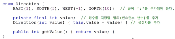 - 열거형의 생성자는 묵시적으로 private이므로, 외부에서 객체생성 불가