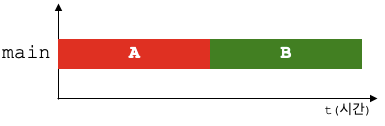 싱글 코어인 경우에는 멀티스레드라도 하나의 코어가 번갈아가면서 작업을 수행 ➡️ 두 작업이 겹치지 않는다.