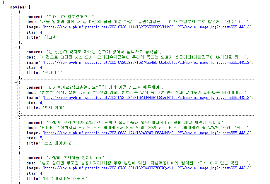 이 오픈 API는 아래에서 보여지는 것과 같이 영화들의 정보를 담고 있다.
