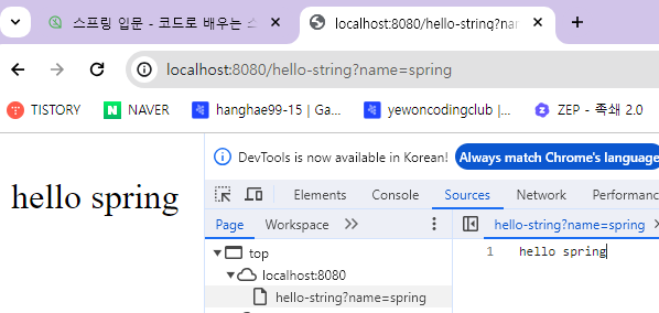 name의 변수값에 따라 "hello {name}" 형태의 문구가 생성되어 웹브라우저로 전달된다.
