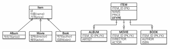 테이블에는 부모 클래스와 자식 클래스의 모든 속성들을 포함한다.