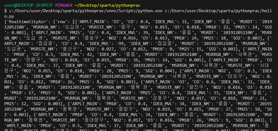 서울시 대기 OpenAPI를 requests 라이브러리를 이용해서 불러오는걸 해볼거다.