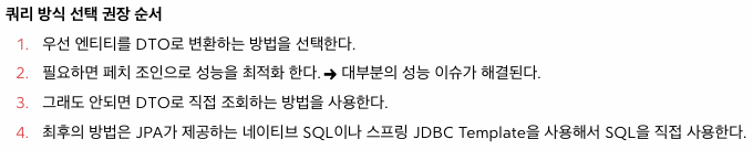 엔티티를 DTO로 변환하거나, DTO로 바로 조회하는 두가지 방법의 장단점을 이해하고, 상황에 따라 더 나은 방법을 선택하면 된다.