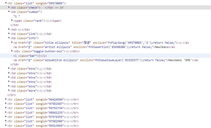 검사를 해봤을때 곡 하나 하나가 <tr> 태그 안에 있음을 확인할 수 있다.