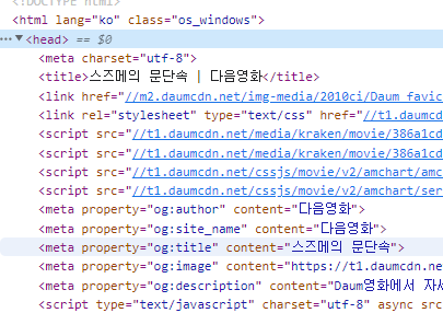 지금 내가 가져온 url은 '다음 영화' 이지만 사실 다른 사이트의 영화 url을 가지고 와도 잘 나타난다. 그 이유는 공통된 meta 태그 형식을 쓰고 있기 때문. 따라서 이런 url들에 국한되지 않고 정보를 가지고 오려면 공통적으로 가지고 있는 이 meta태그의 요소를 그대로 가지고 오는 것이 좋다!