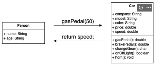또한 자동차 객체는 gasPedal(50); 메서드에서 속도를 바꾸는 작업을 수행한 후 사람 객체에게 실행 결과인 속도의 값을 반환할 수 있습니다. 이때 반환되는 값을 ‘리턴값’ 이라 표현합니다.