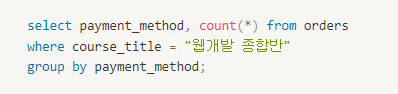 - select payment_method, count(*): payment_method에 따라 합쳐진 데이터가 각각 몇 개가 합쳐진 것인지 세어줍니다.