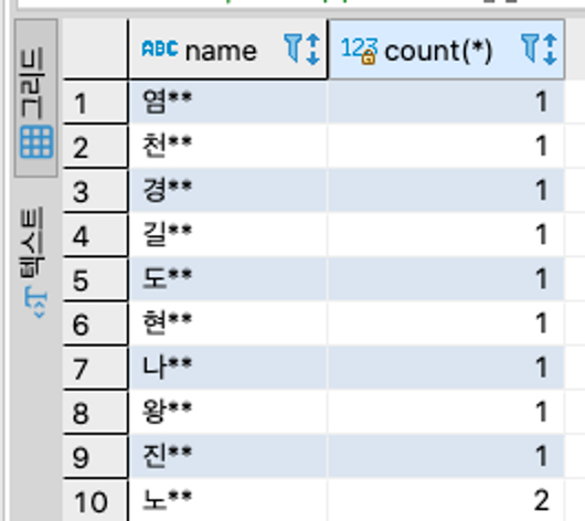 -성씨별로 몇 명의 회원이 있는지 구하려고 Where 절을 사용해서 수십개의 쿼리를 장성하는 것은 너무 비효율적이다.